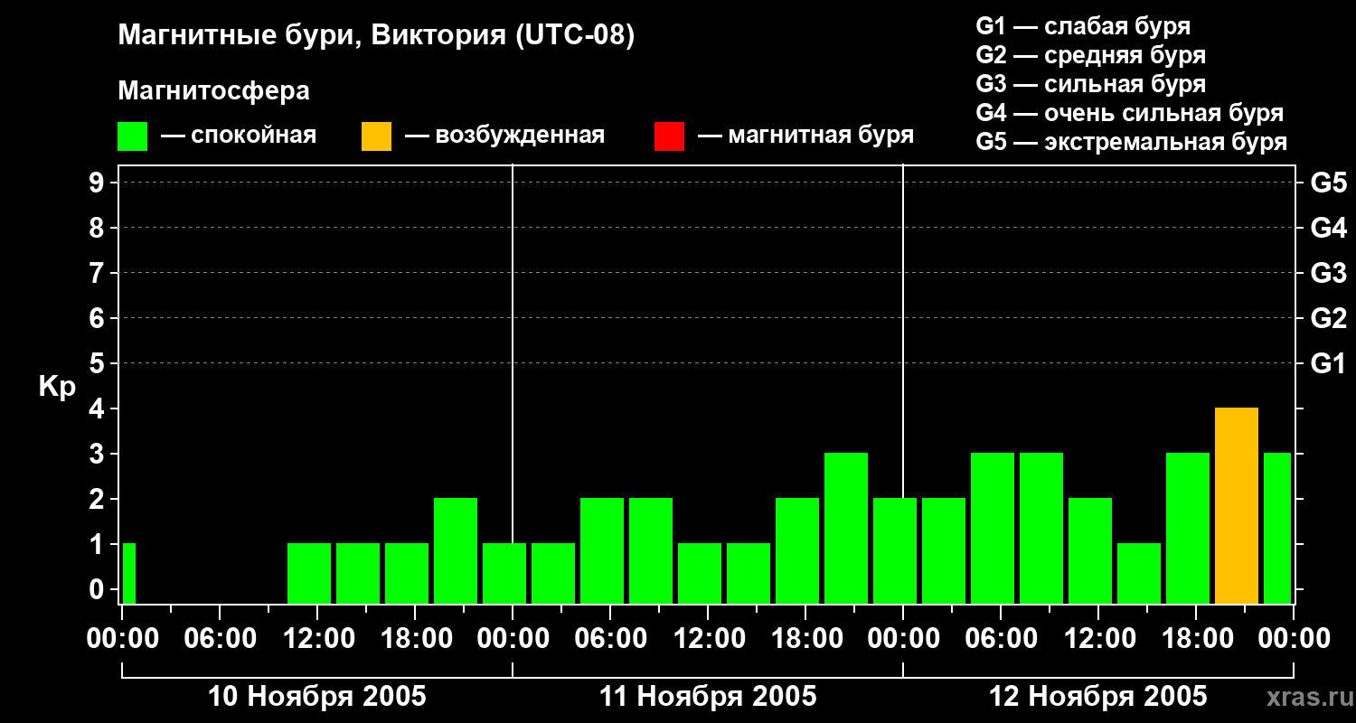 Изменения геомагнитного индекса Kp с 10 по 12 ноября 2005 года для средних широт