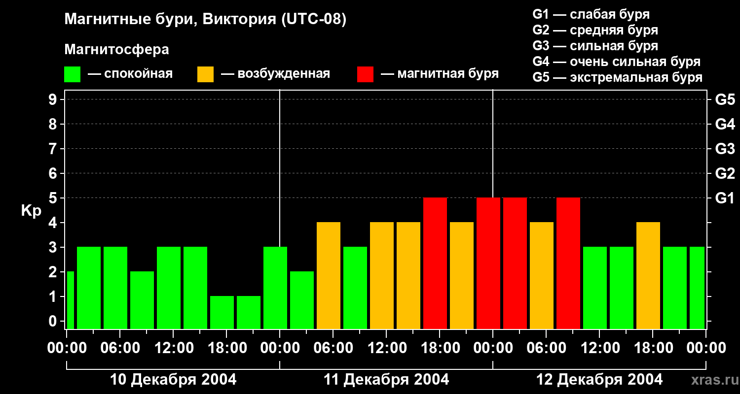 Изменения геомагнитного индекса Kp с 10 по 12 декабря 2004 года для средних широт