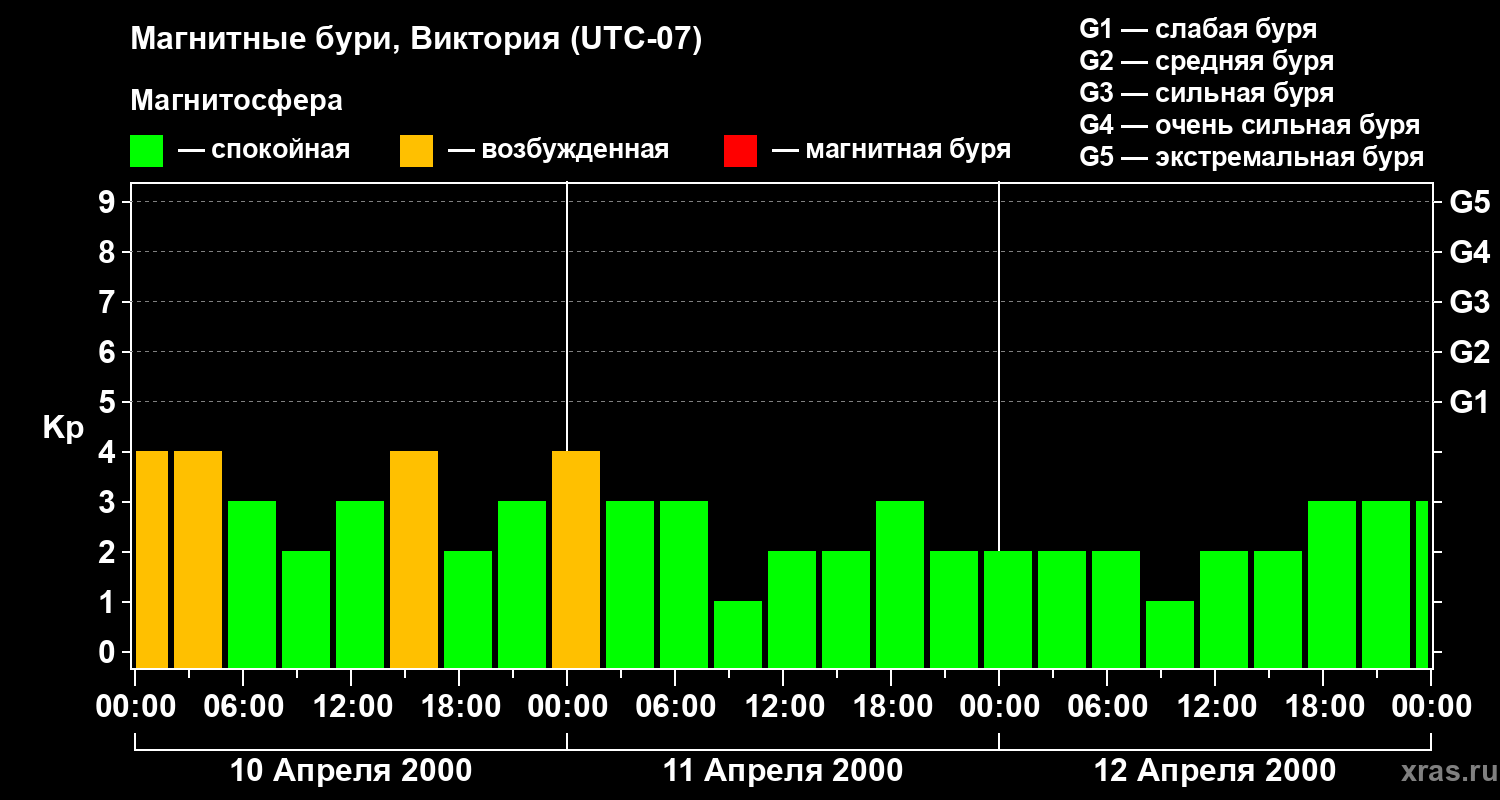 Изменения геомагнитного индекса Kp с 10 по 12 апреля 2000 года для средних широт