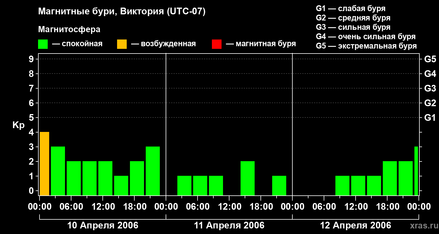 Изменения геомагнитного индекса Kp с 10 по 12 апреля 2006 года для средних широт