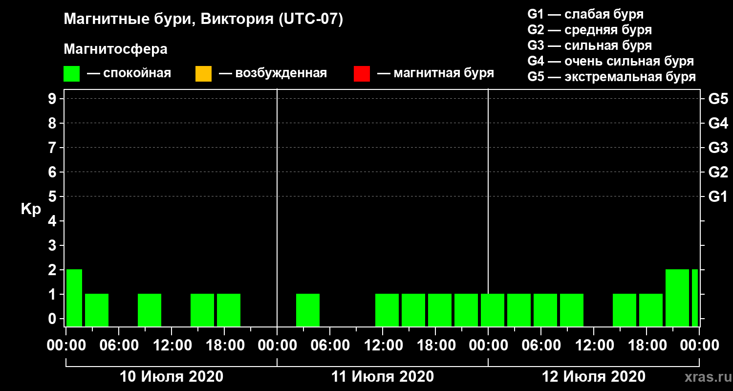 Изменения геомагнитного индекса Kp с 10 по 12 июля 2020 года для средних широт