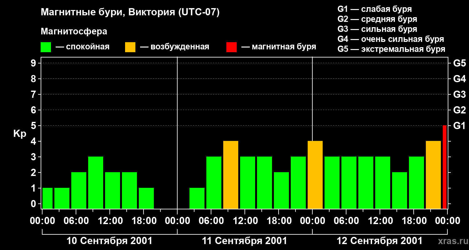 Изменения геомагнитного индекса Kp с 10 по 12 сентября 2001 года для средних широт