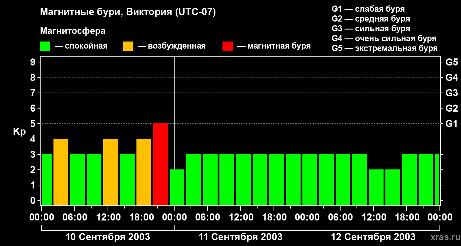 Изменения геомагнитного индекса Kp с 10 по 12 сентября 2003 года для средних широт