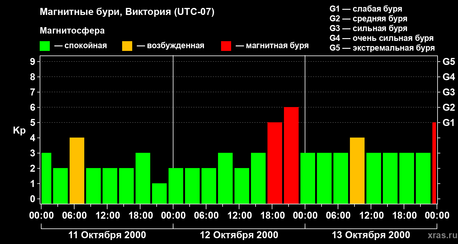 Изменения геомагнитного индекса Kp с 11 по 13 октября 2000 года для средних широт
