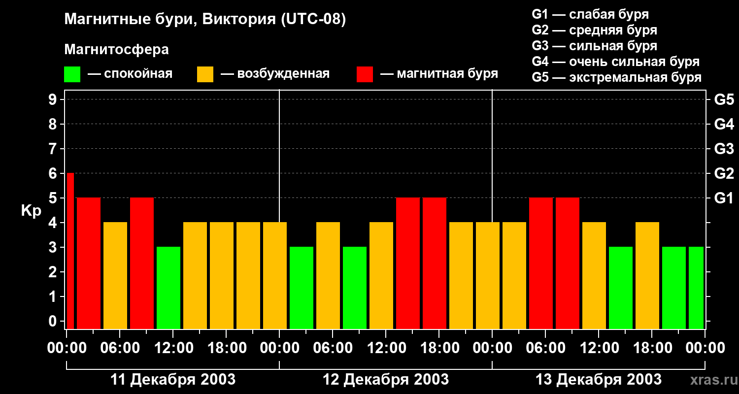 Изменения геомагнитного индекса Kp с 11 по 13 декабря 2003 года для средних широт
