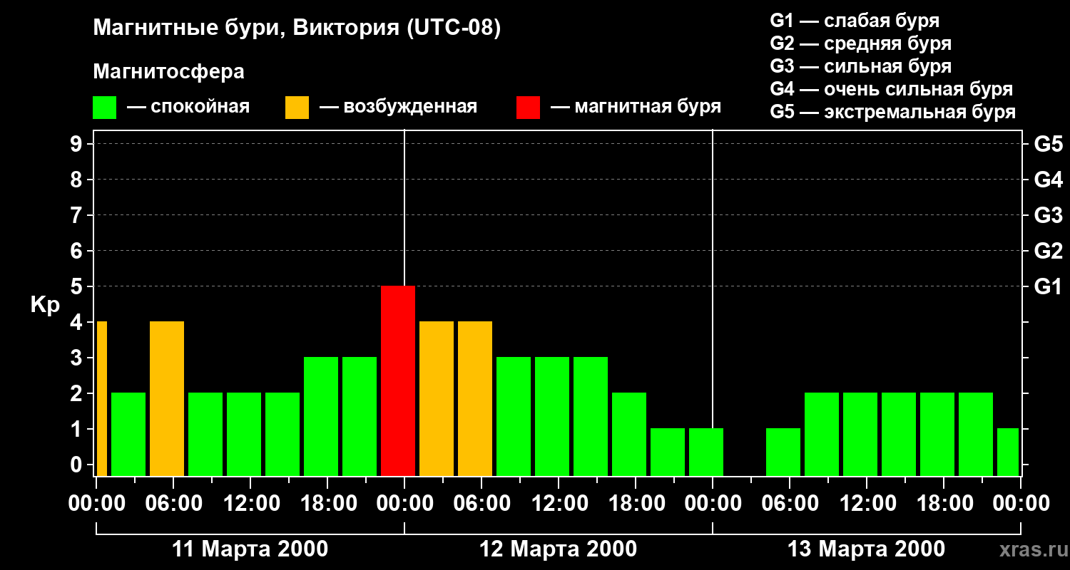 Изменения геомагнитного индекса Kp с 11 по 13 марта 2000 года для средних широт