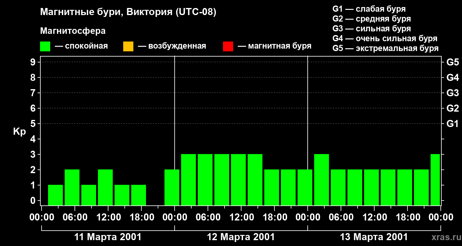 Изменения геомагнитного индекса Kp с 11 по 13 марта 2001 года для средних широт