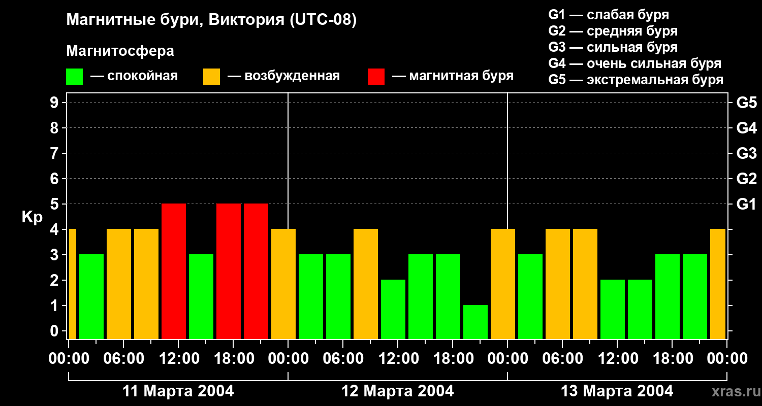 Изменения геомагнитного индекса Kp с 11 по 13 марта 2004 года для средних широт