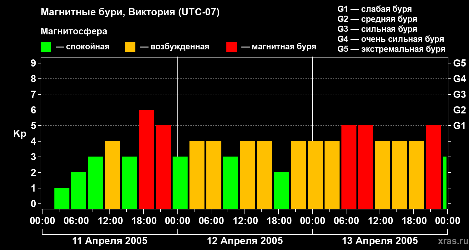 Изменения геомагнитного индекса Kp с 11 по 13 апреля 2005 года для средних широт