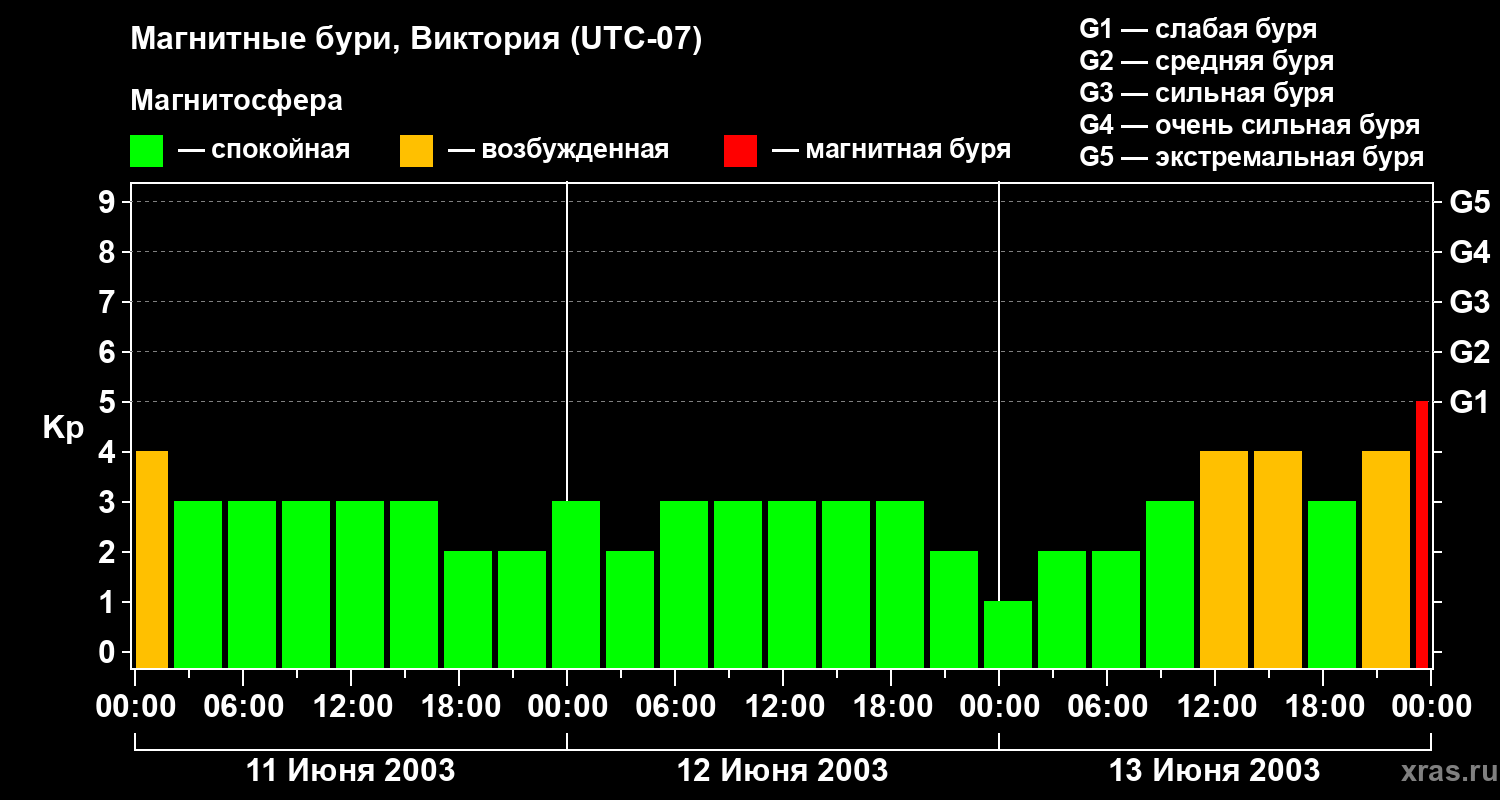 Изменения геомагнитного индекса Kp с 11 по 13 июня 2003 года для средних широт