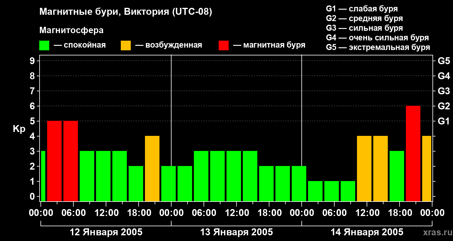 Изменения геомагнитного индекса Kp с 12 по 14 января 2005 года для средних широт