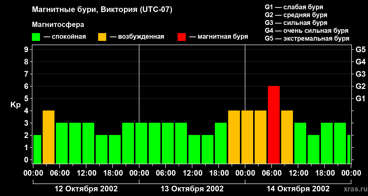 Изменения геомагнитного индекса Kp с 12 по 14 октября 2002 года для средних широт