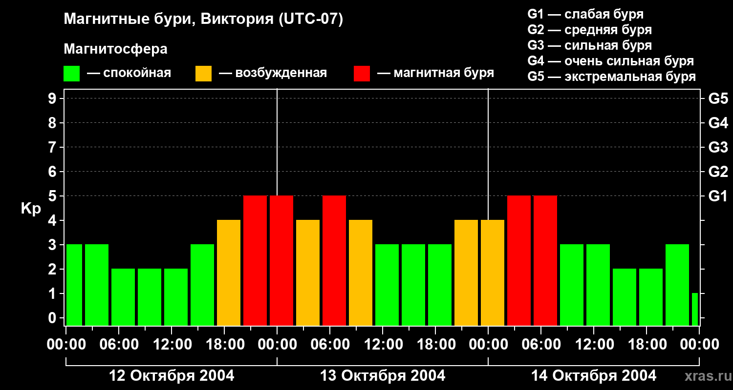Изменения геомагнитного индекса Kp с 12 по 14 октября 2004 года для средних широт