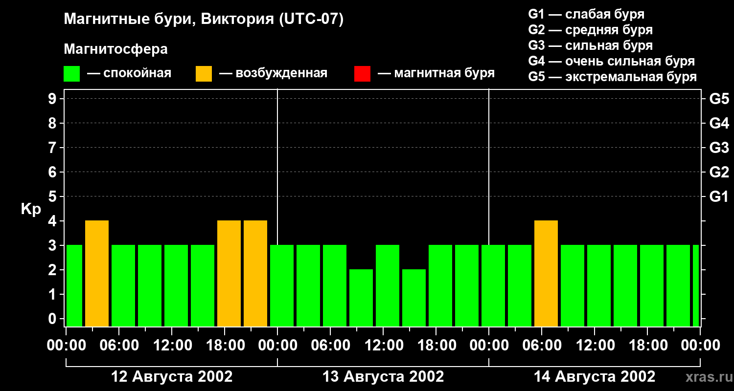 Изменения геомагнитного индекса Kp с 12 по 14 августа 2002 года для средних широт