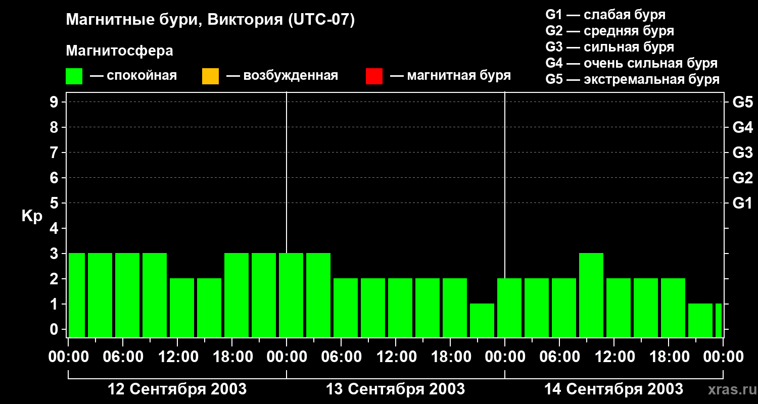 Изменения геомагнитного индекса Kp с 12 по 14 сентября 2003 года для средних широт