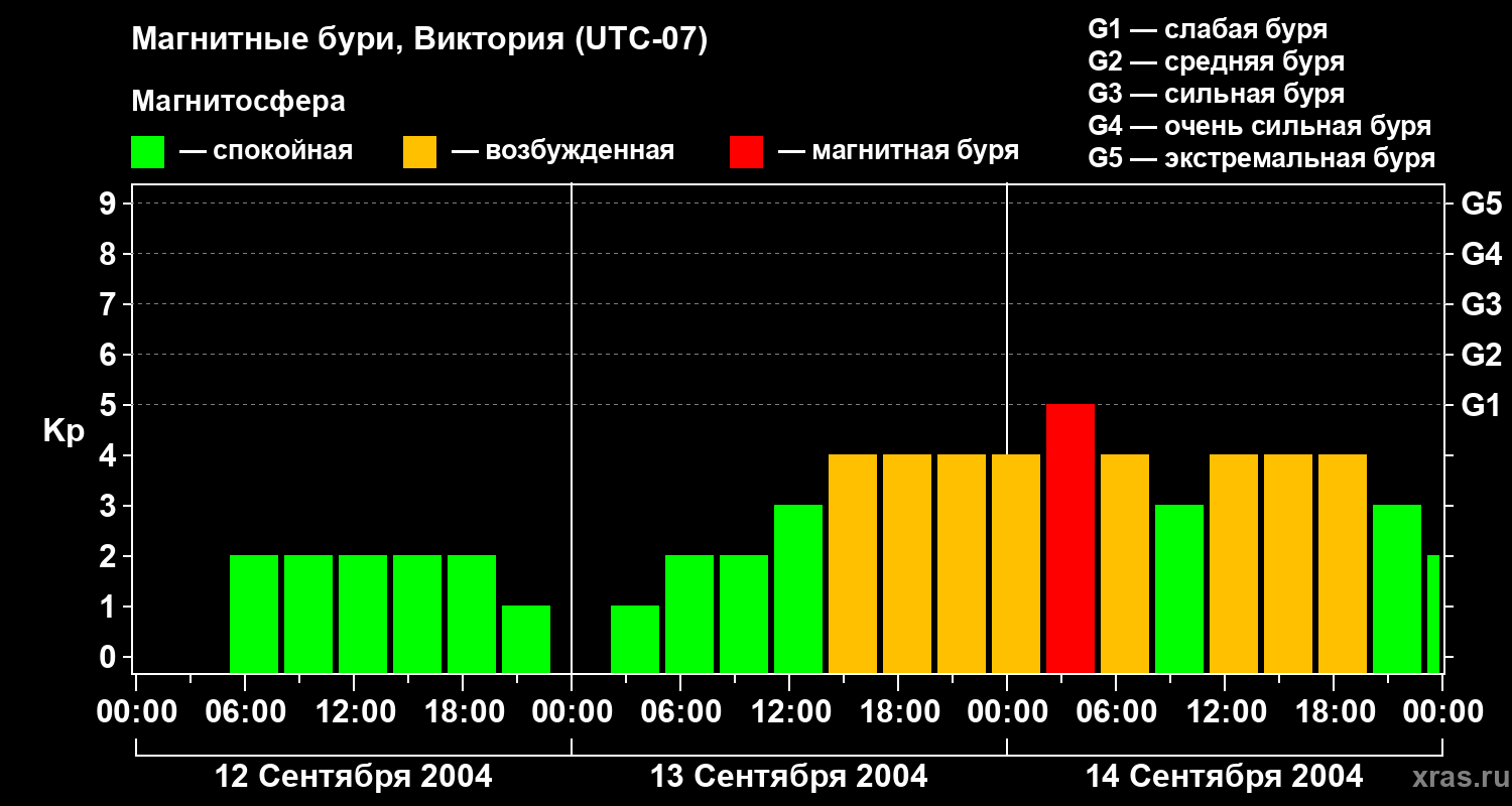 Изменения геомагнитного индекса Kp с 12 по 14 сентября 2004 года для средних широт