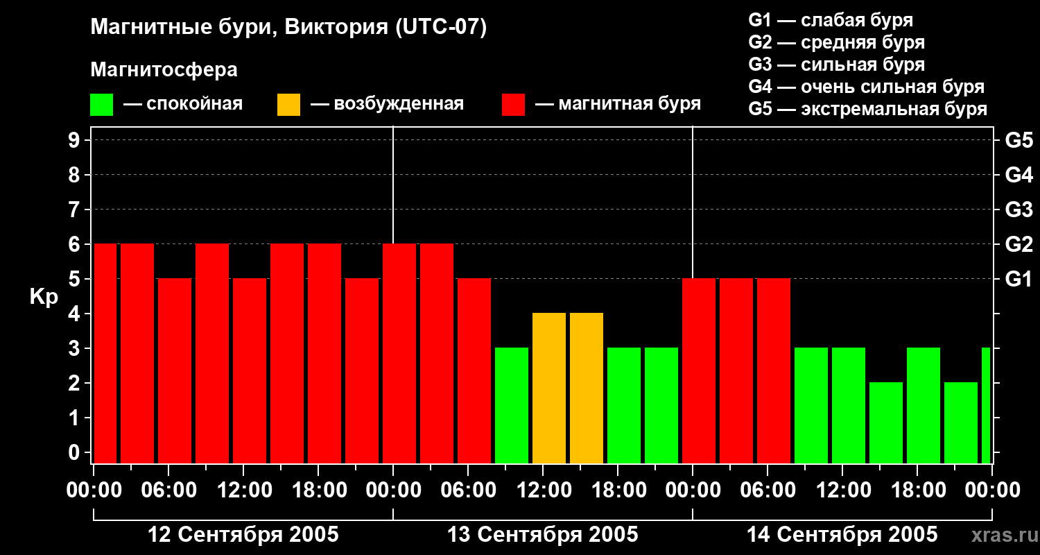 Изменения геомагнитного индекса Kp с 12 по 14 сентября 2005 года для средних широт