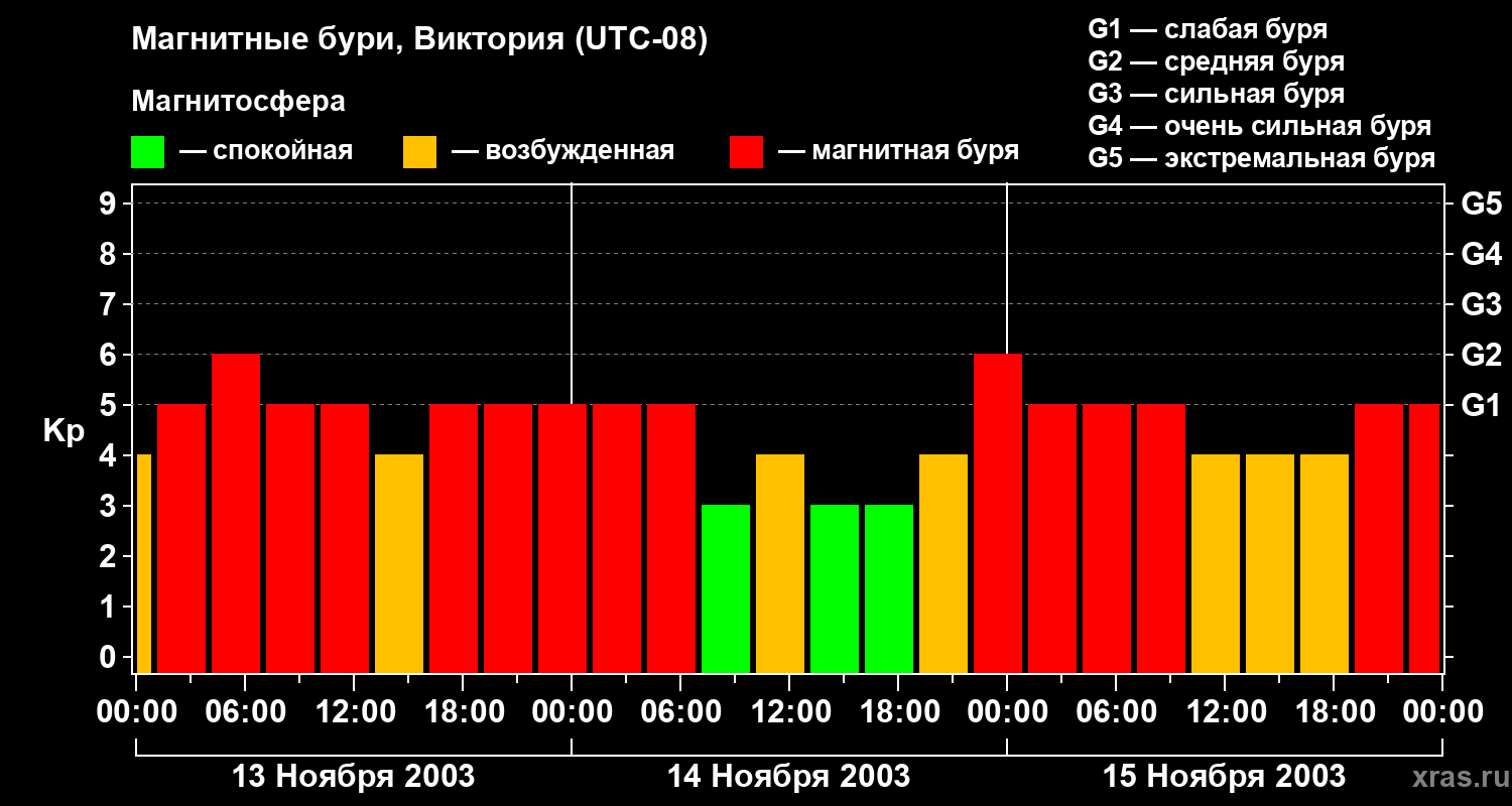Изменения геомагнитного индекса Kp с 13 по 15 ноября 2003 года для средних широт