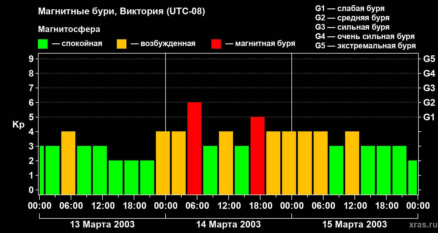 Изменения геомагнитного индекса Kp с 13 по 15 марта 2003 года для средних широт