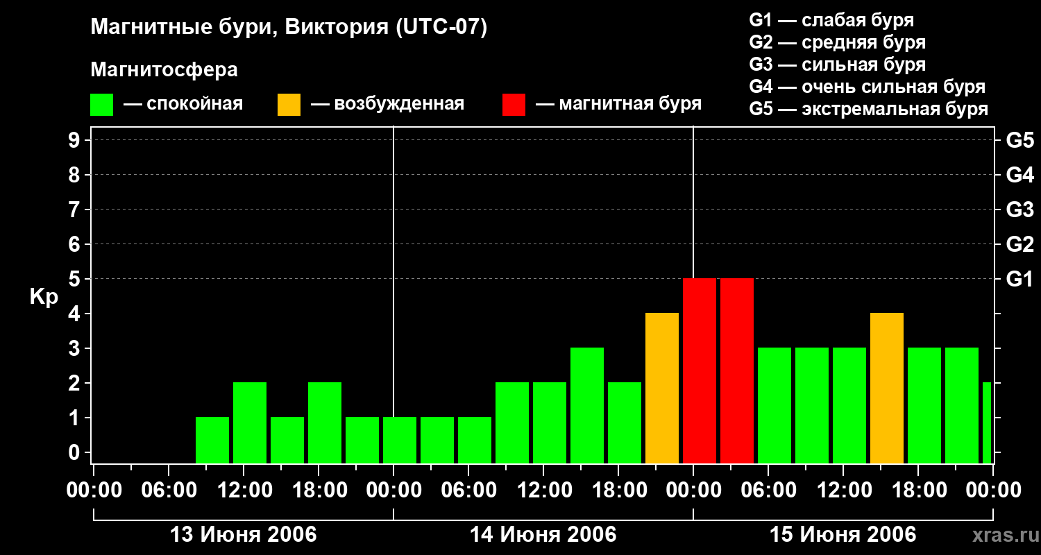 Изменения геомагнитного индекса Kp с 13 по 15 июня 2006 года для средних широт