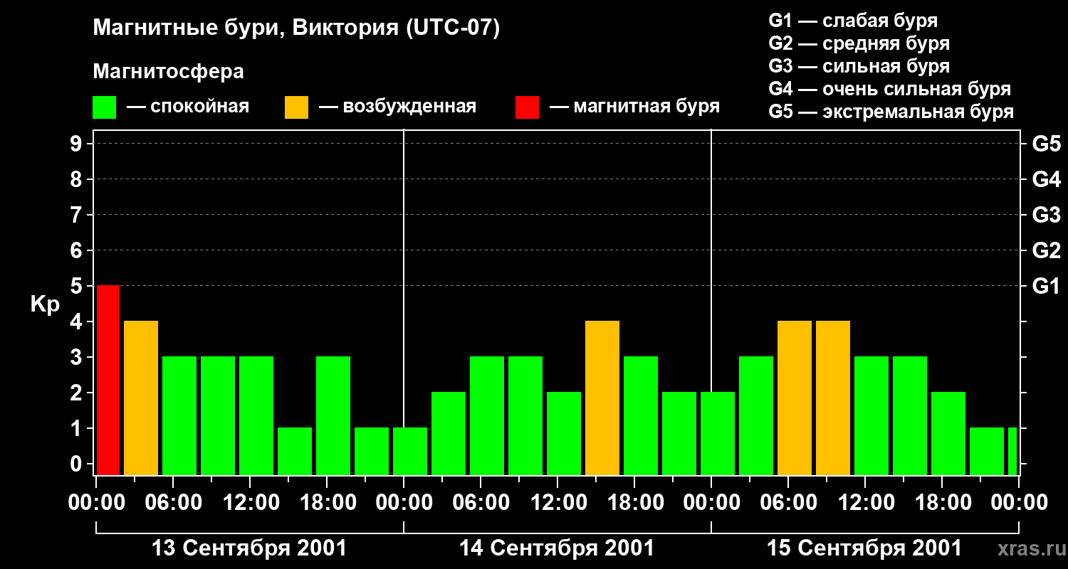 Изменения геомагнитного индекса Kp с 13 по 15 сентября 2001 года для средних широт