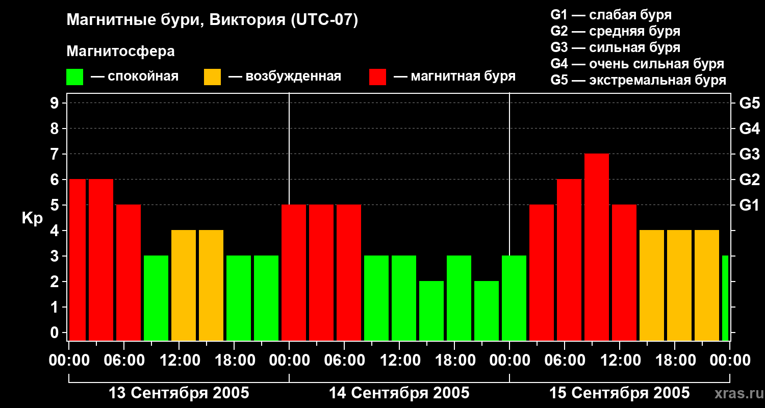 Изменения геомагнитного индекса Kp с 13 по 15 сентября 2005 года для средних широт