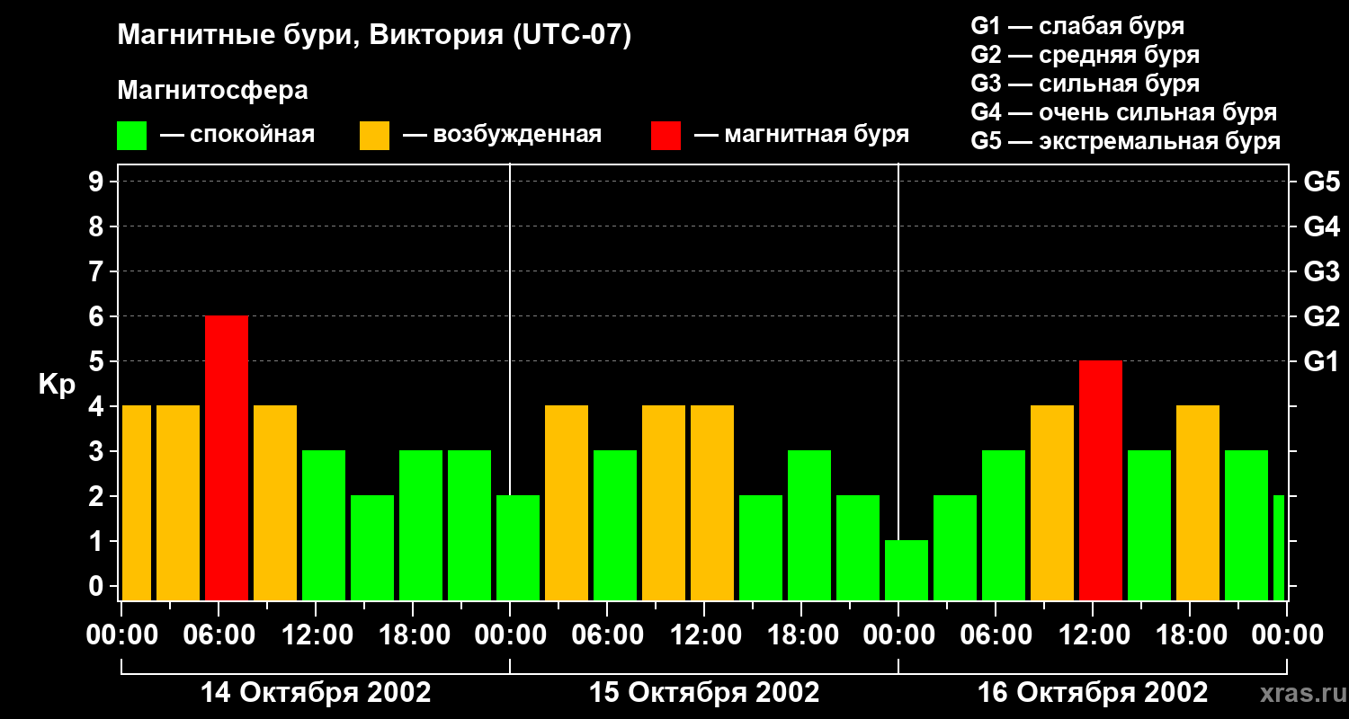 Изменения геомагнитного индекса Kp с 14 по 16 октября 2002 года для средних широт