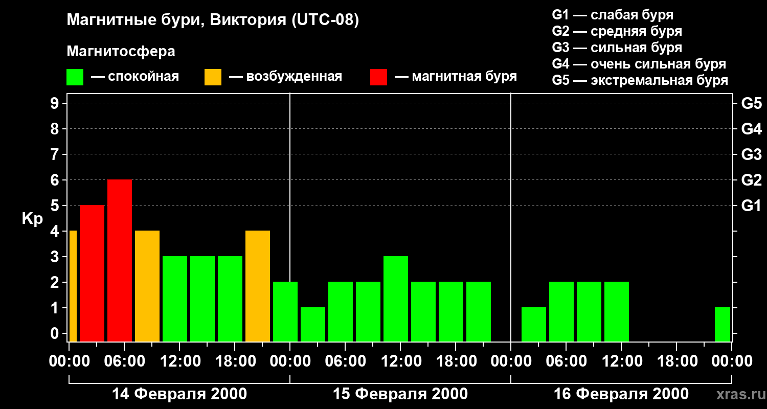 Изменения геомагнитного индекса Kp с 14 по 16 февраля 2000 года для средних широт