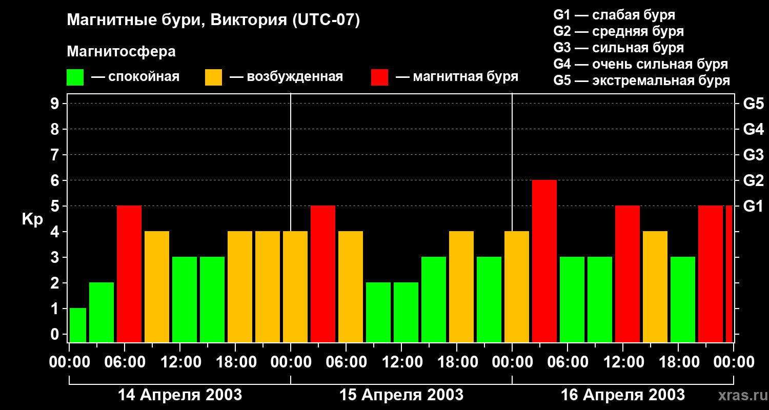 Изменения геомагнитного индекса Kp с 14 по 16 апреля 2003 года для средних широт