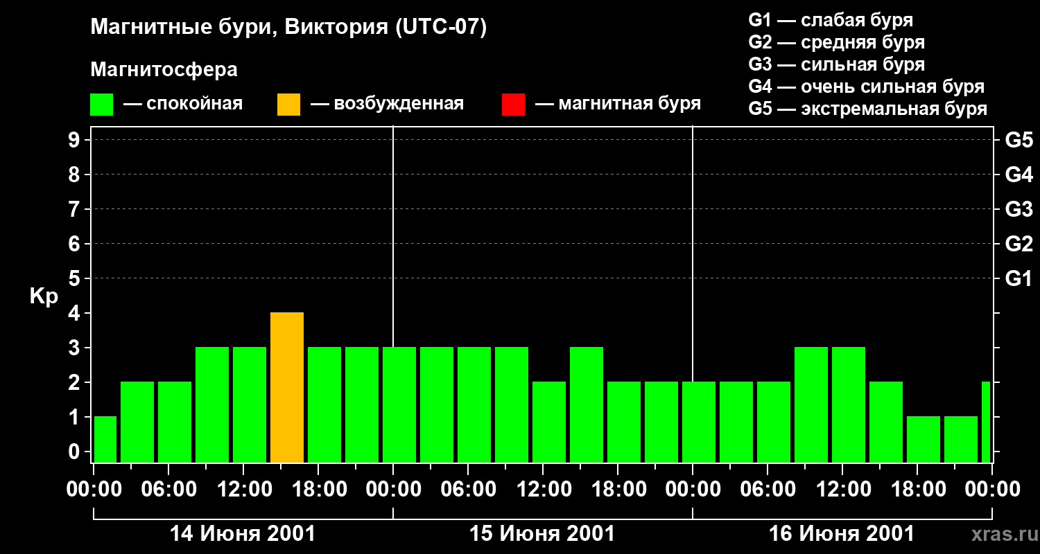 Изменения геомагнитного индекса Kp с 14 по 16 июня 2001 года для средних широт
