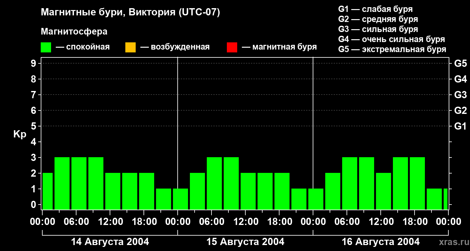 Изменения геомагнитного индекса Kp с 14 по 16 августа 2004 года для средних широт