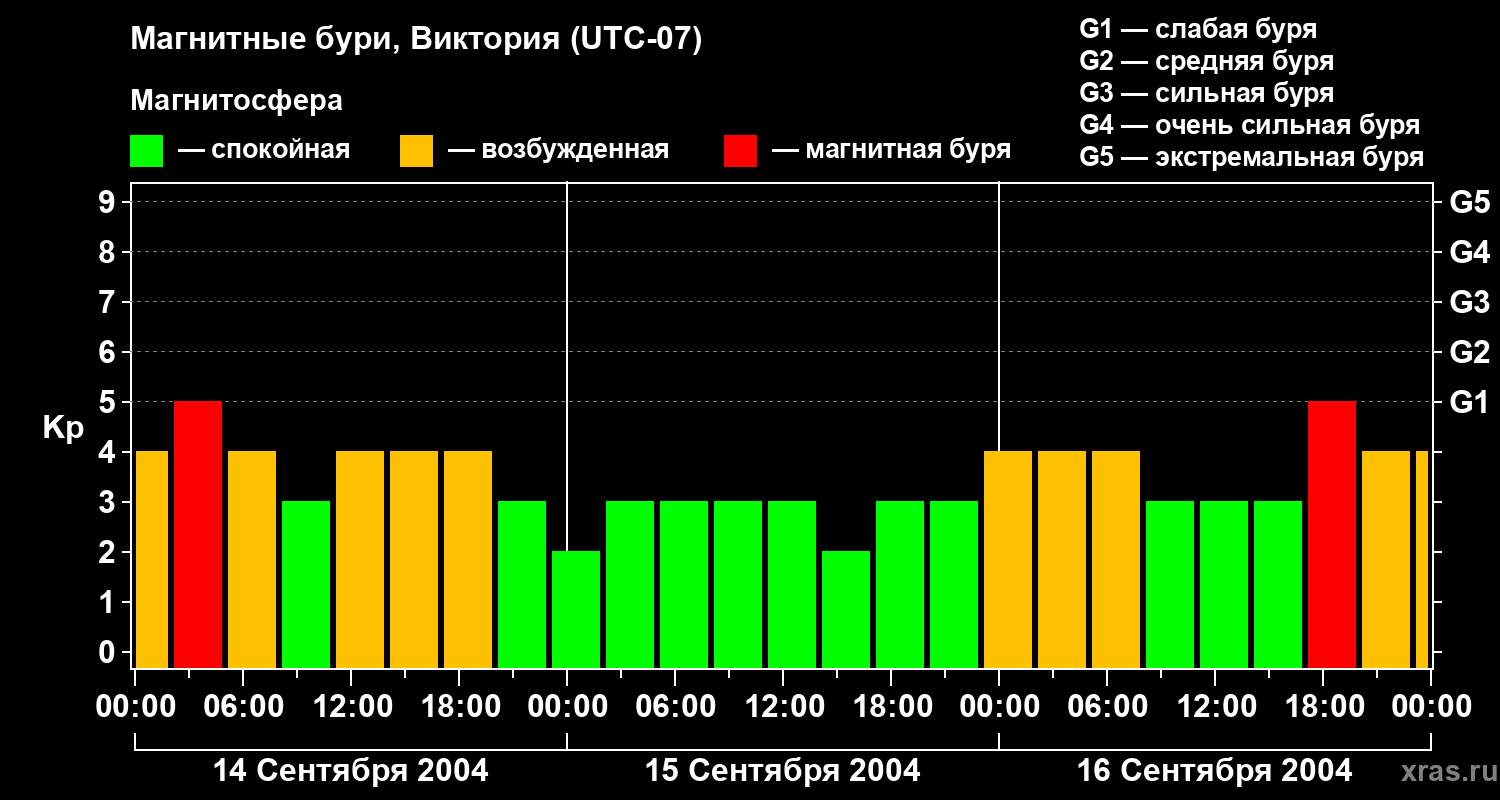 Изменения геомагнитного индекса Kp с 14 по 16 сентября 2004 года для средних широт