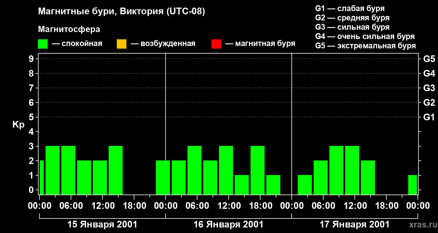 Изменения геомагнитного индекса Kp с 15 по 17 января 2001 года для средних широт