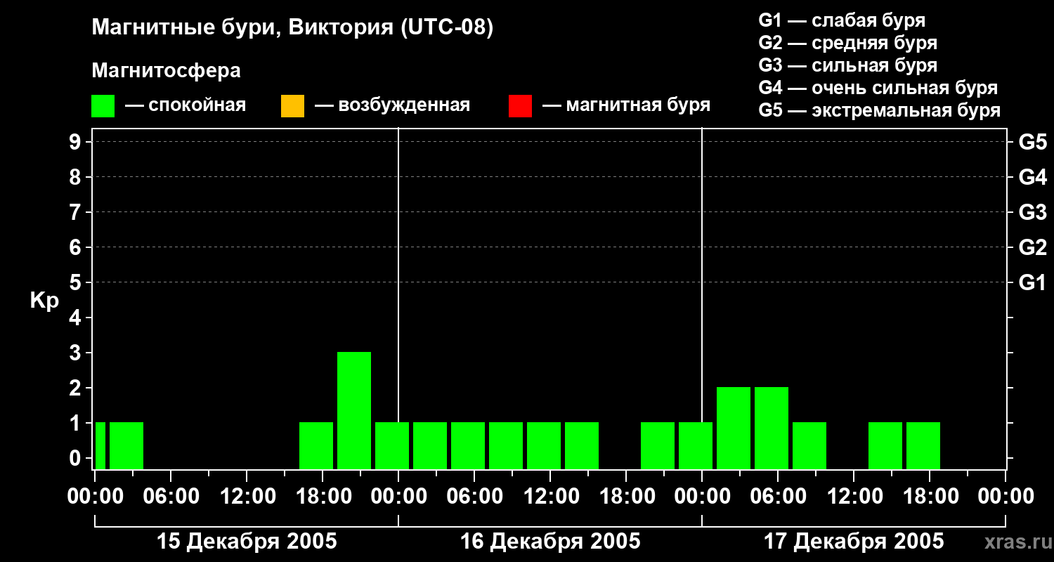 Изменения геомагнитного индекса Kp с 15 по 17 декабря 2005 года для средних широт
