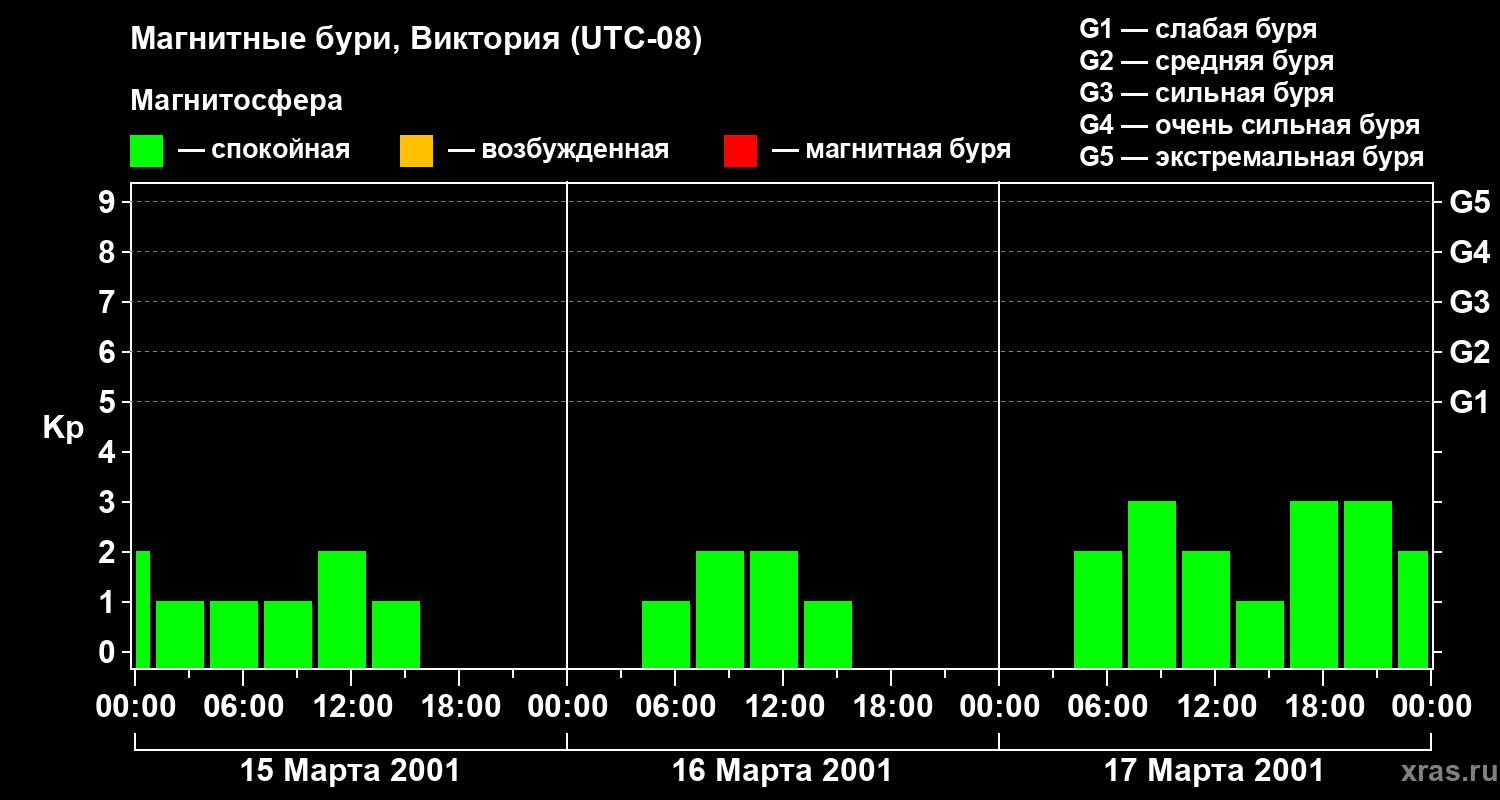Изменения геомагнитного индекса Kp с 15 по 17 марта 2001 года для средних широт