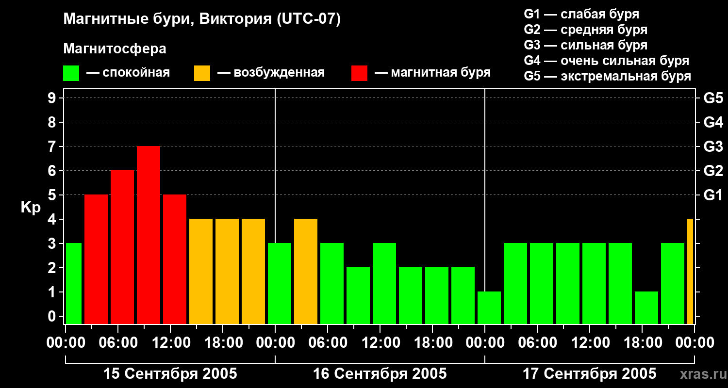 Изменения геомагнитного индекса Kp с 15 по 17 сентября 2005 года для средних широт