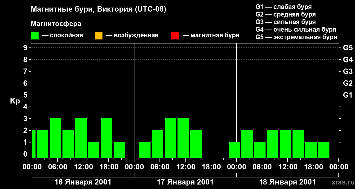 Изменения геомагнитного индекса Kp с 16 по 18 января 2001 года для средних широт