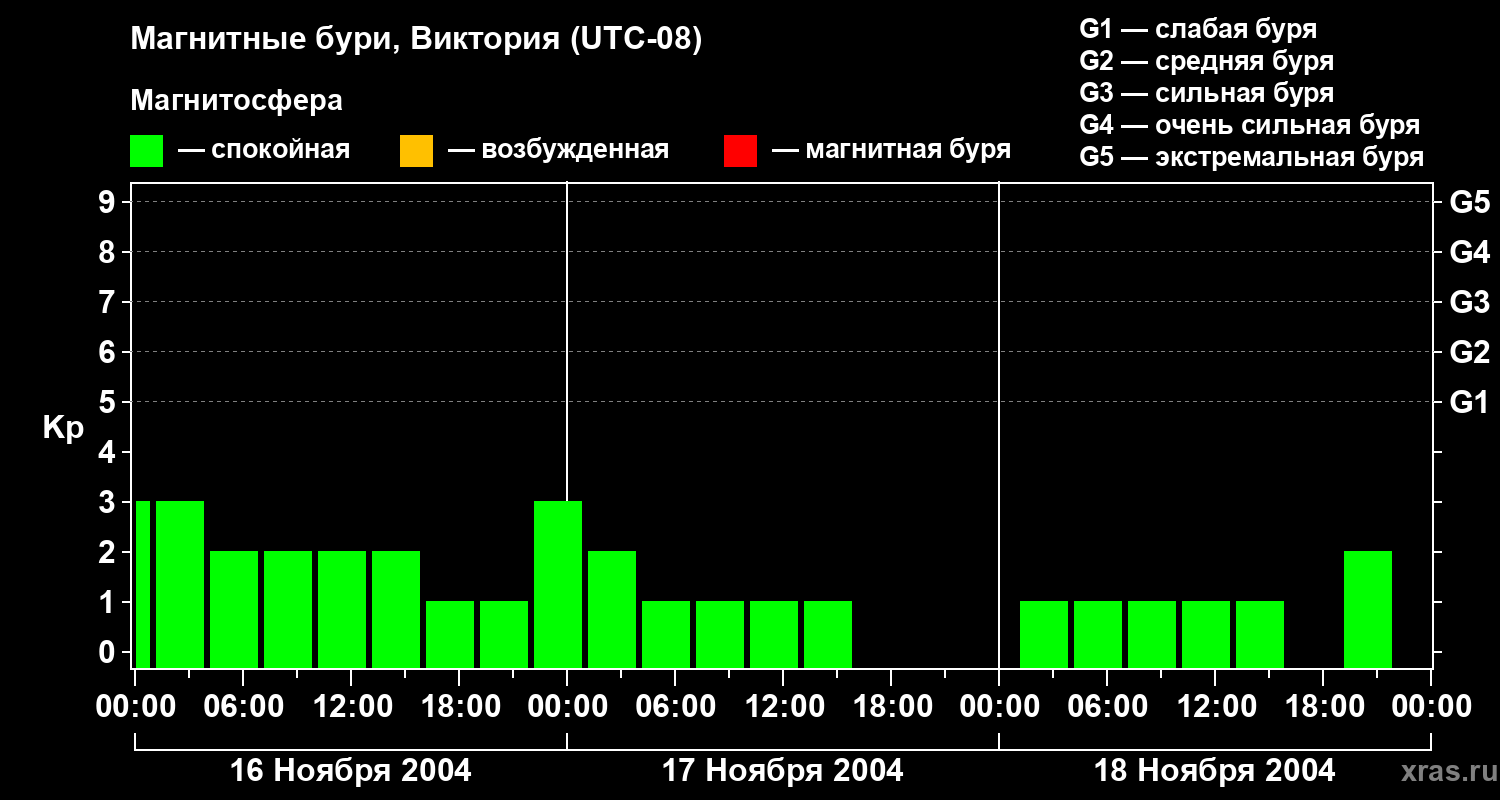 Изменения геомагнитного индекса Kp с 16 по 18 ноября 2004 года для средних широт