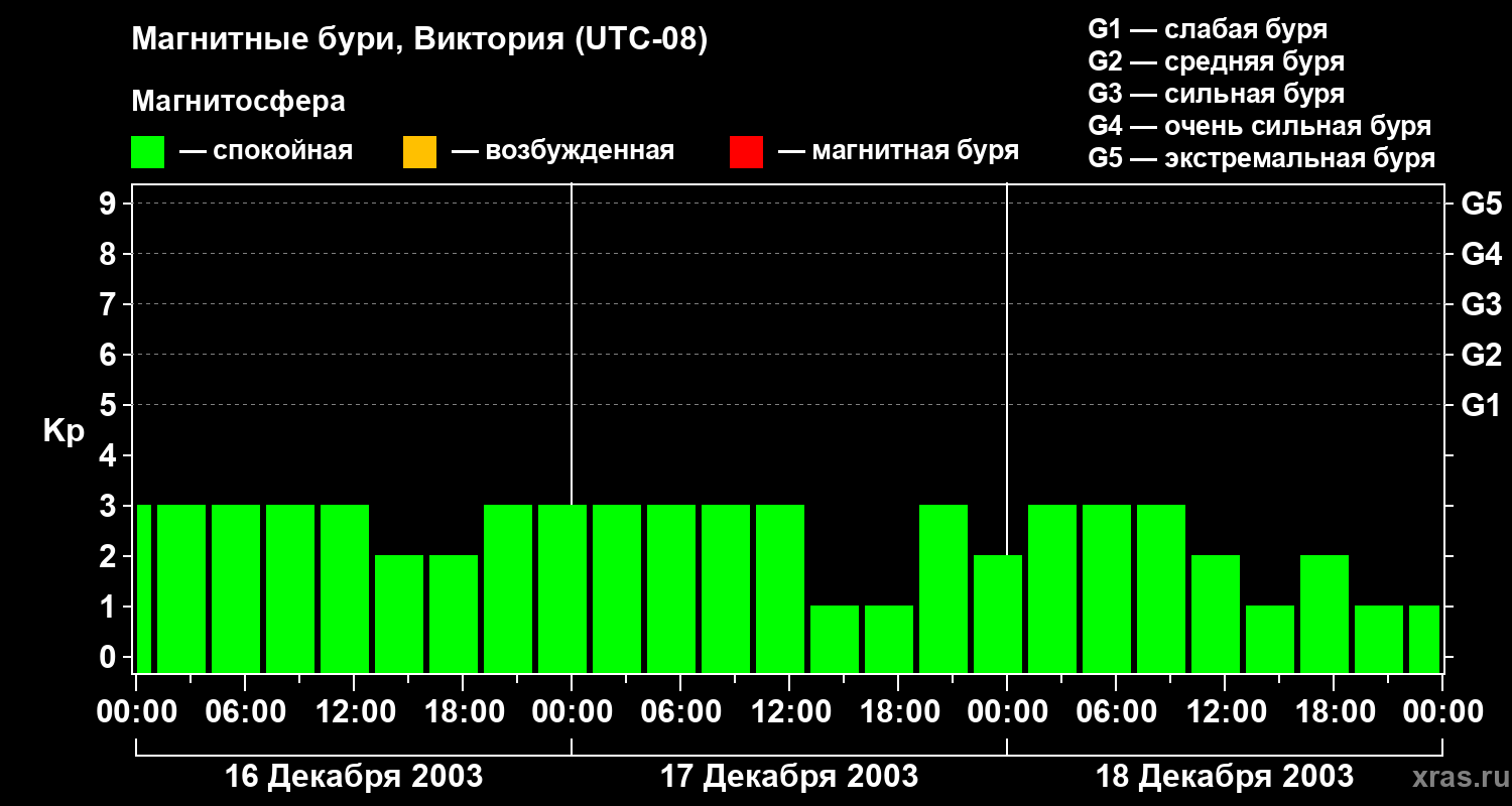 Изменения геомагнитного индекса Kp с 16 по 18 декабря 2003 года для средних широт