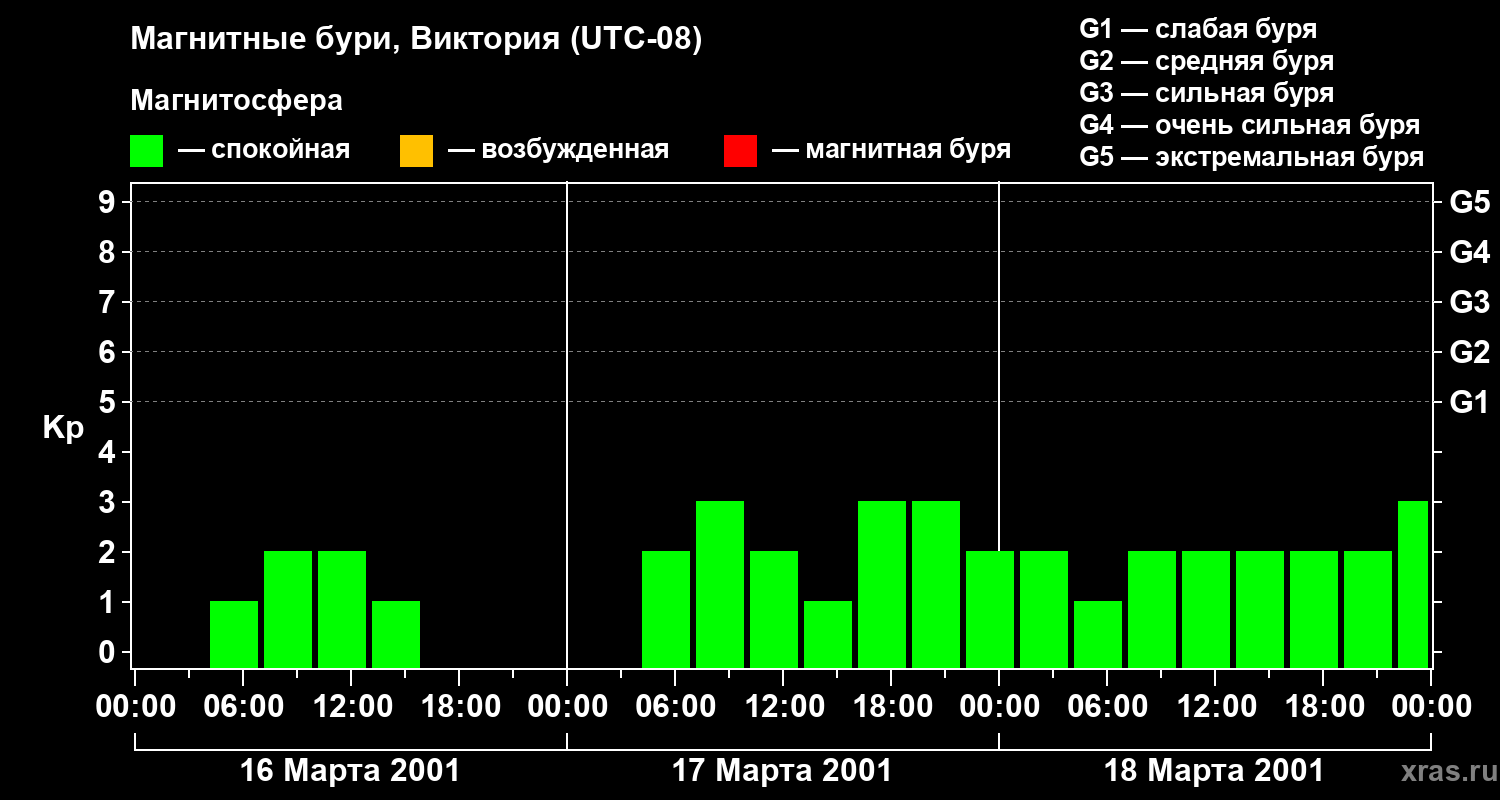 Изменения геомагнитного индекса Kp с 16 по 18 марта 2001 года для средних широт