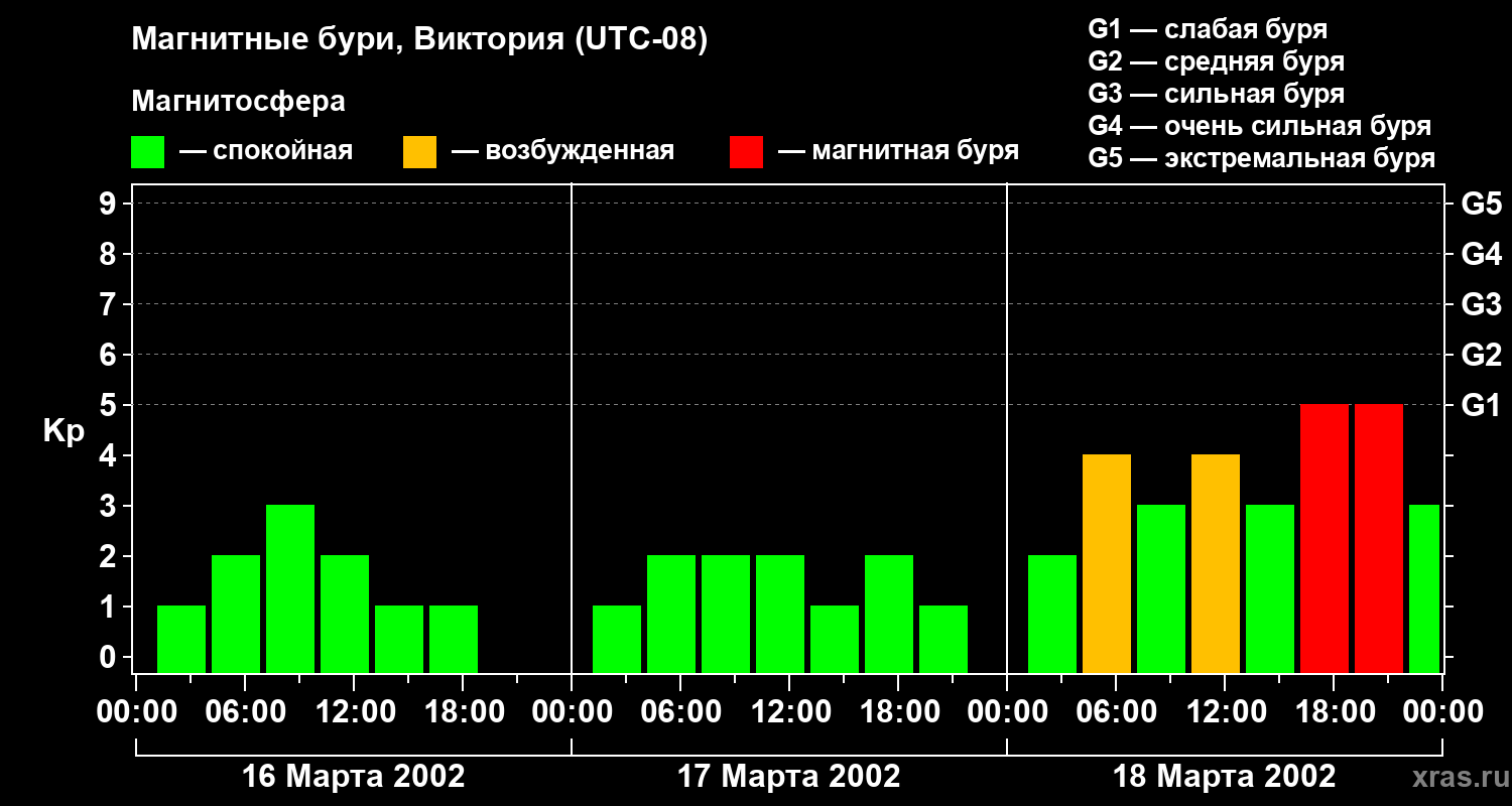 Изменения геомагнитного индекса Kp с 16 по 18 марта 2002 года для средних широт