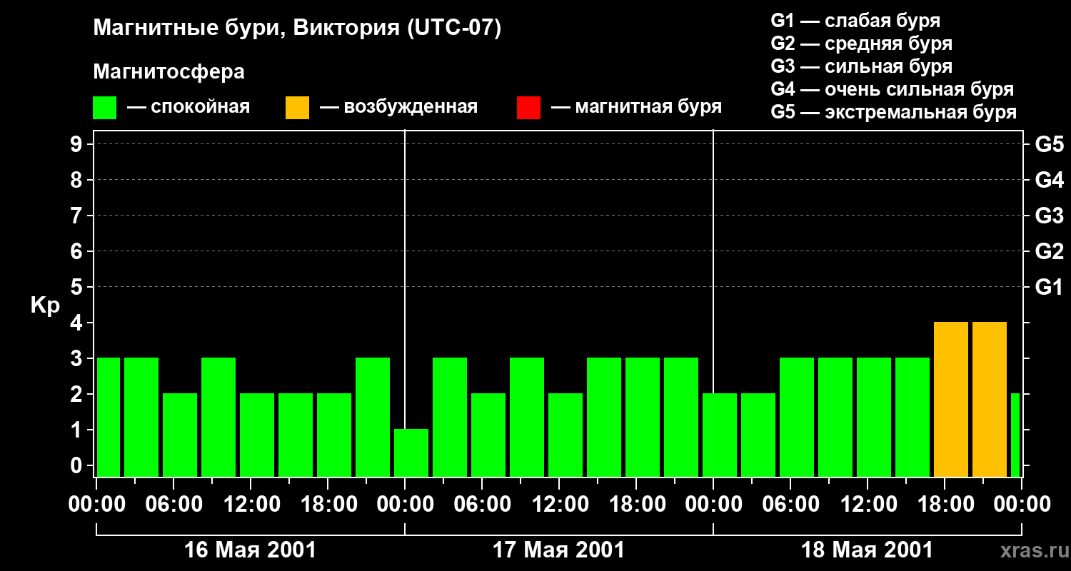 Изменения геомагнитного индекса Kp с 16 по 18 мая 2001 года для средних широт
