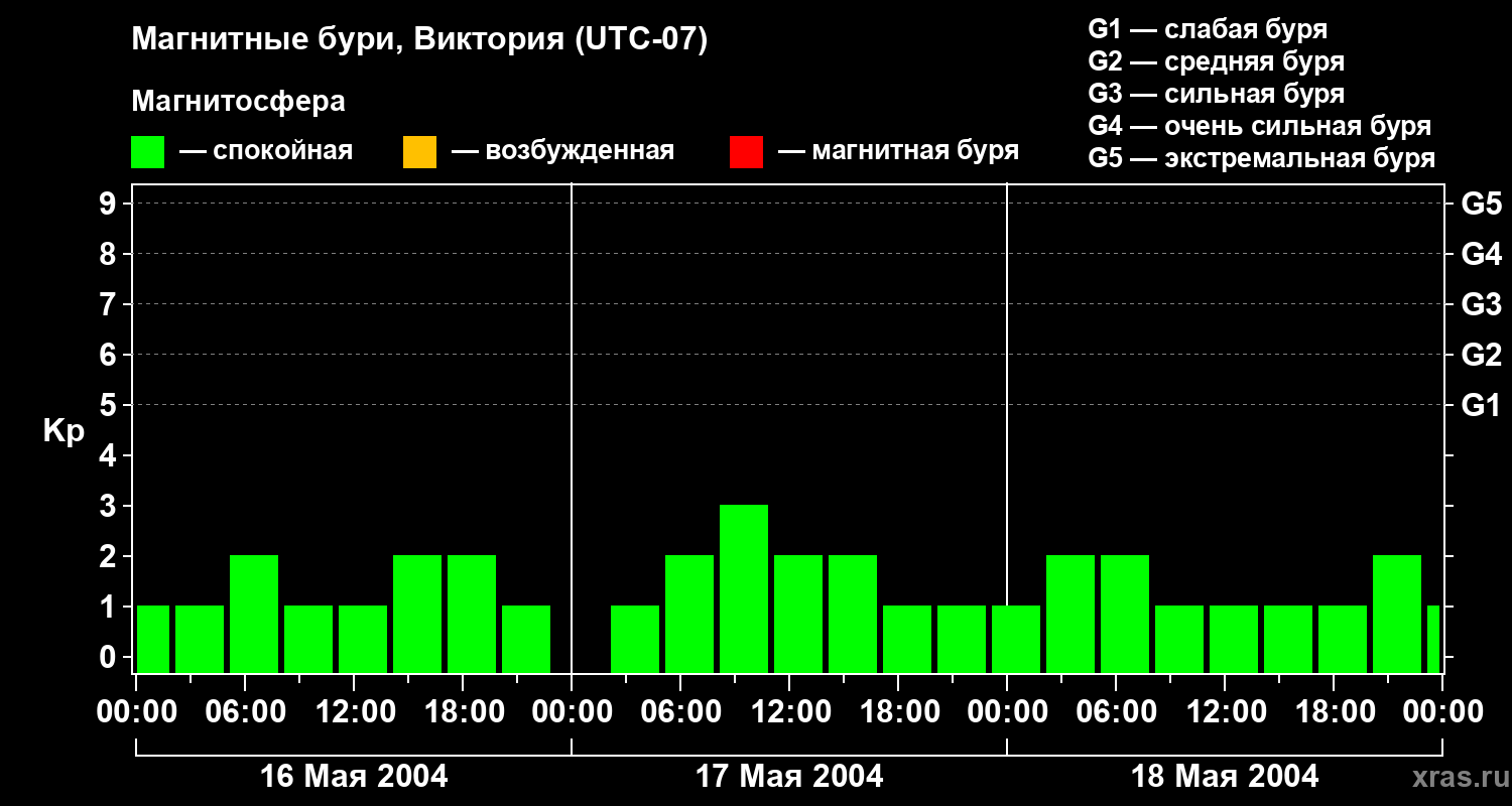 Изменения геомагнитного индекса Kp с 16 по 18 мая 2004 года для средних широт