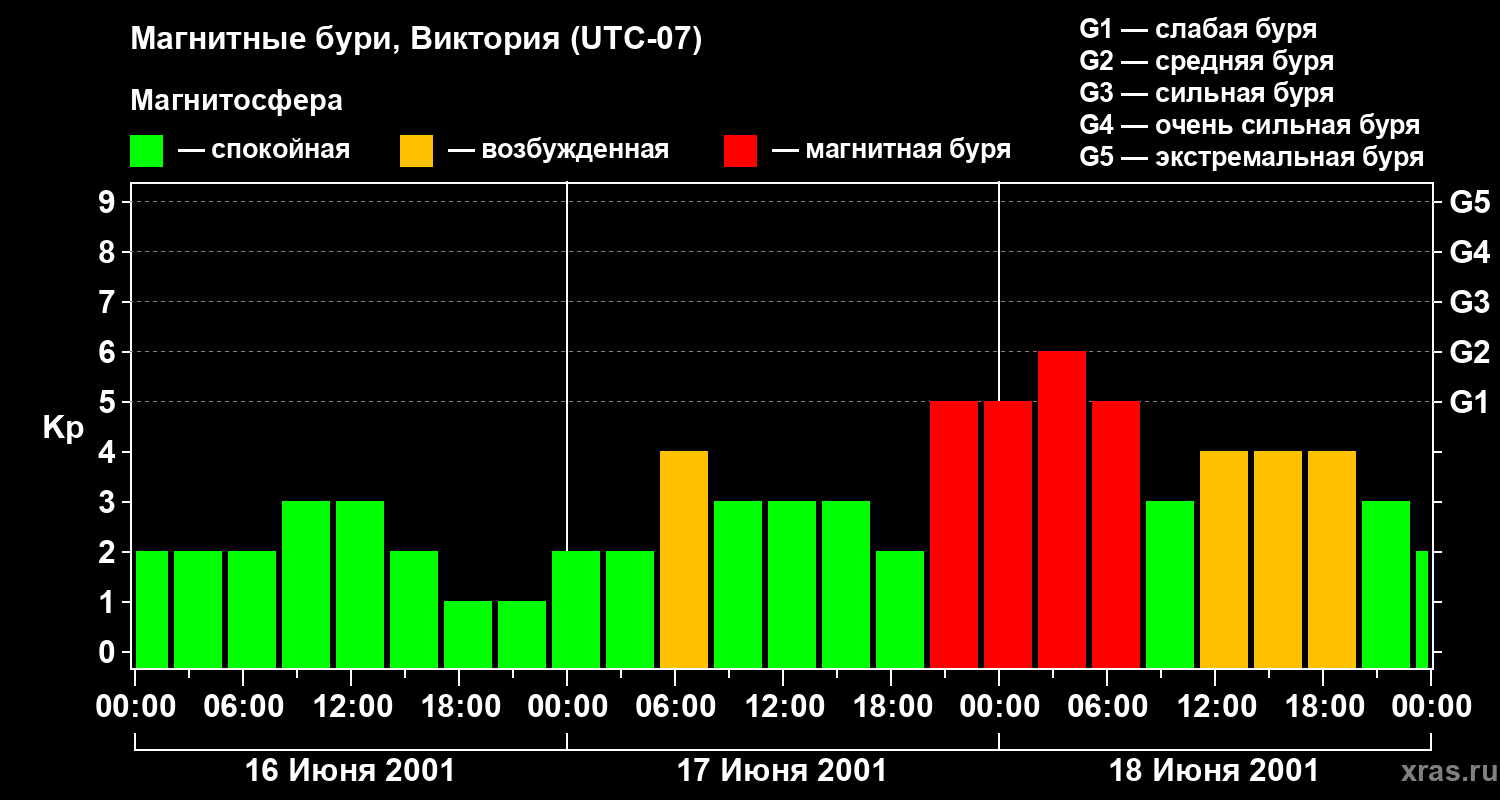 Изменения геомагнитного индекса Kp с 16 по 18 июня 2001 года для средних широт
