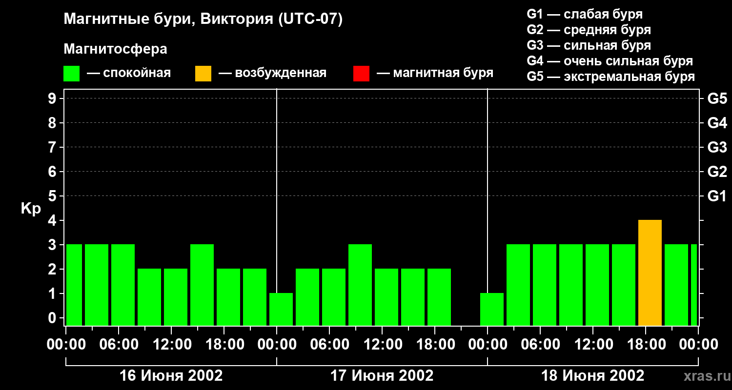 Изменения геомагнитного индекса Kp с 16 по 18 июня 2002 года для средних широт