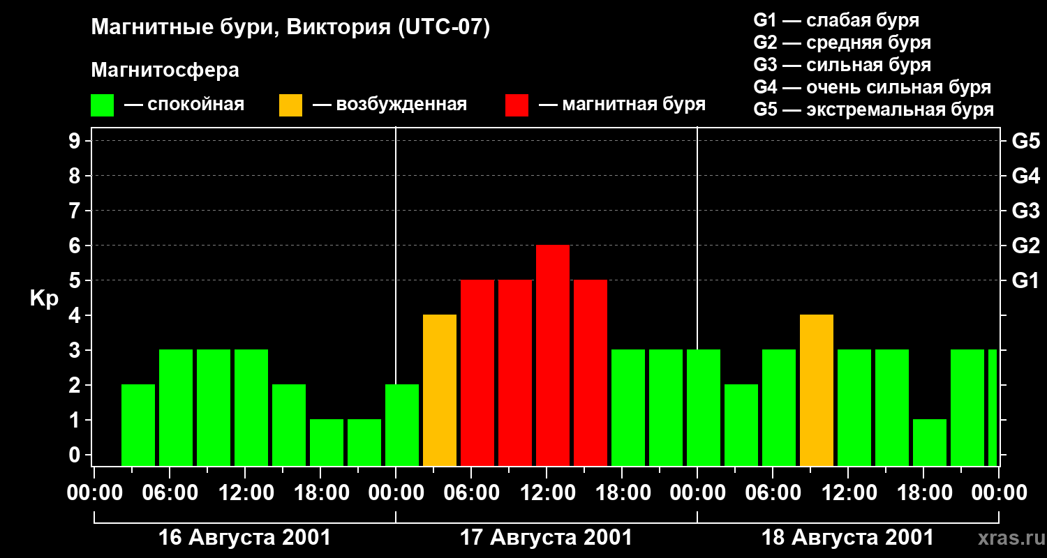 Изменения геомагнитного индекса Kp с 16 по 18 августа 2001 года для средних широт