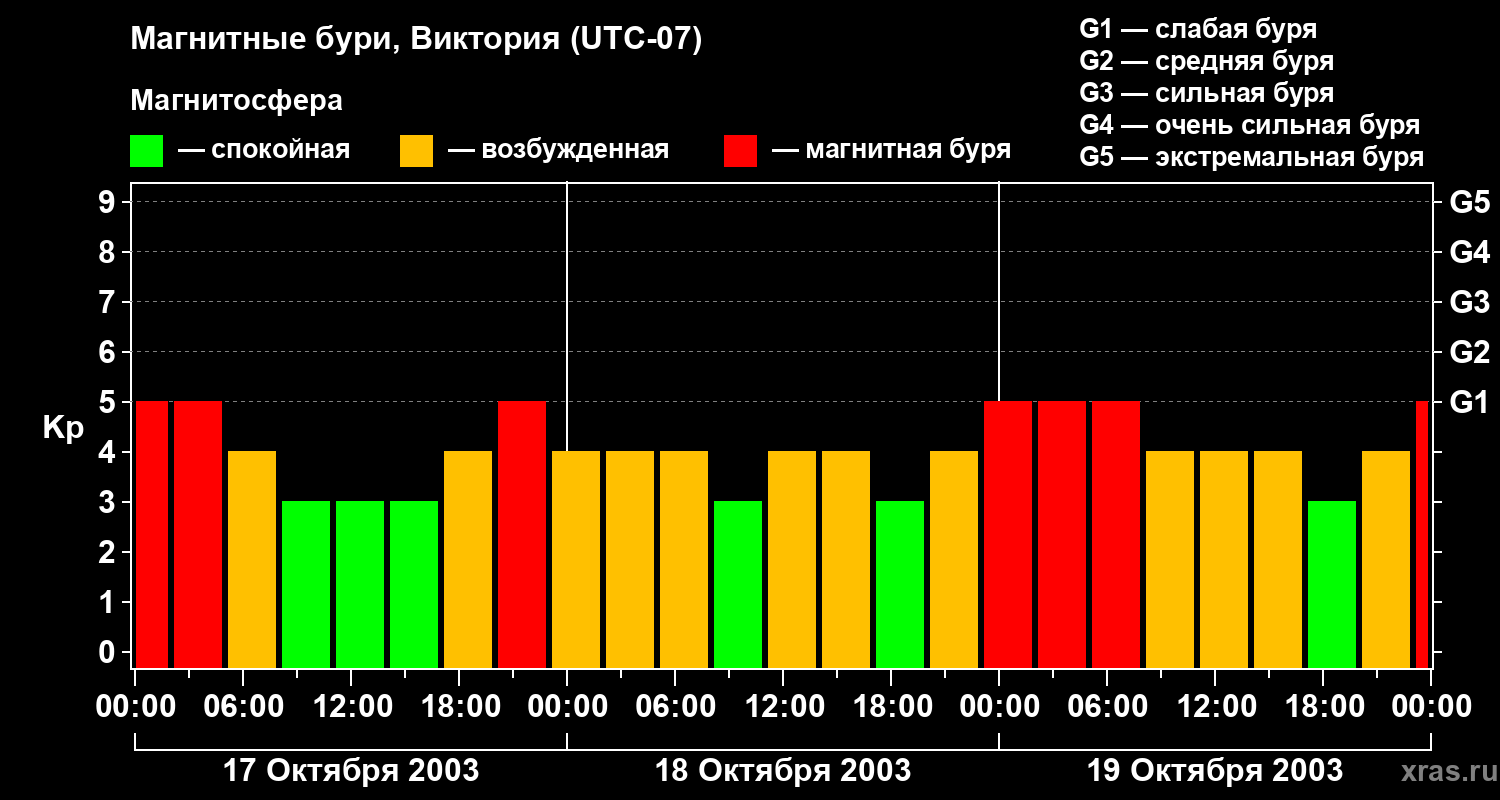 Изменения геомагнитного индекса Kp с 17 по 19 октября 2003 года для средних широт