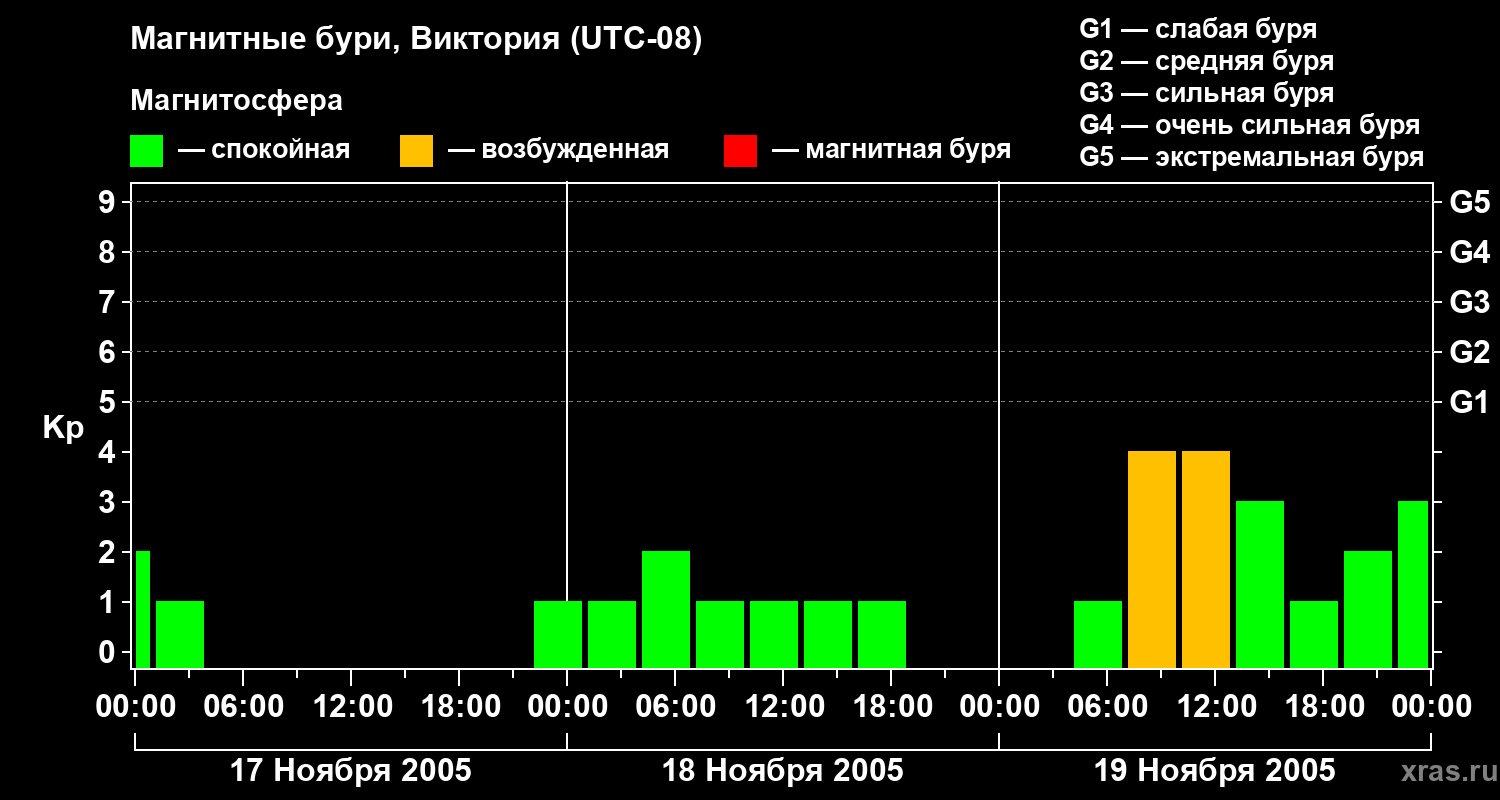 Изменения геомагнитного индекса Kp с 17 по 19 ноября 2005 года для средних широт