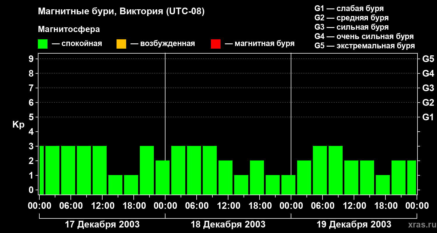 Изменения геомагнитного индекса Kp с 17 по 19 декабря 2003 года для средних широт
