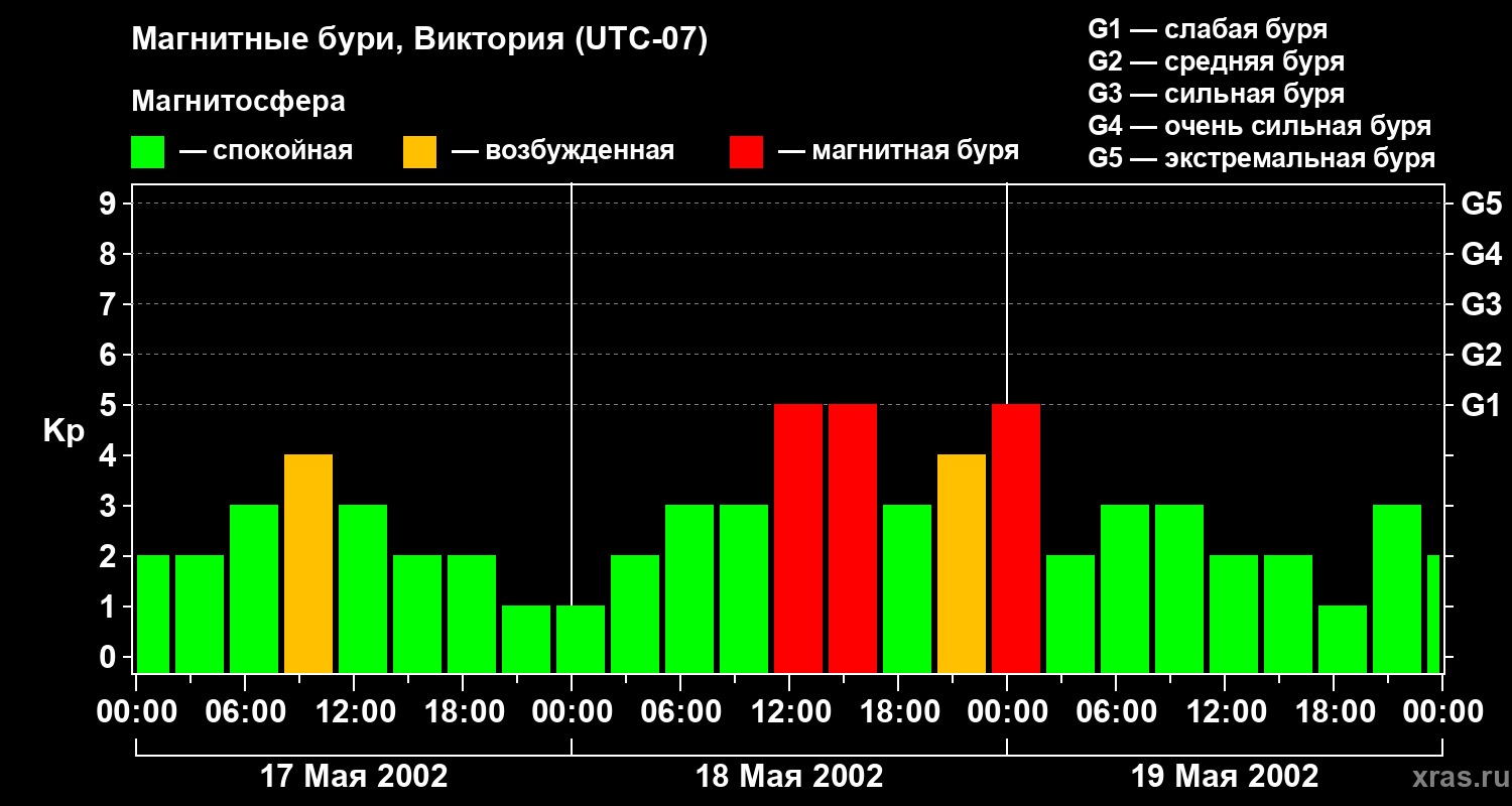 Изменения геомагнитного индекса Kp с 17 по 19 мая 2002 года для средних широт